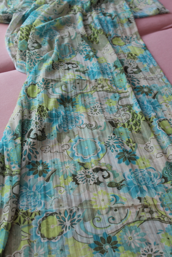 - längs gecrashte/plissierte Streifen siehe Bilder, blau-grüne Blumen, Kunstfaser, transparent und zart (für Sommerröcke-Kleider, Blusen) 140 x 155 cm + Anhängsel von 70 x 150 cm
