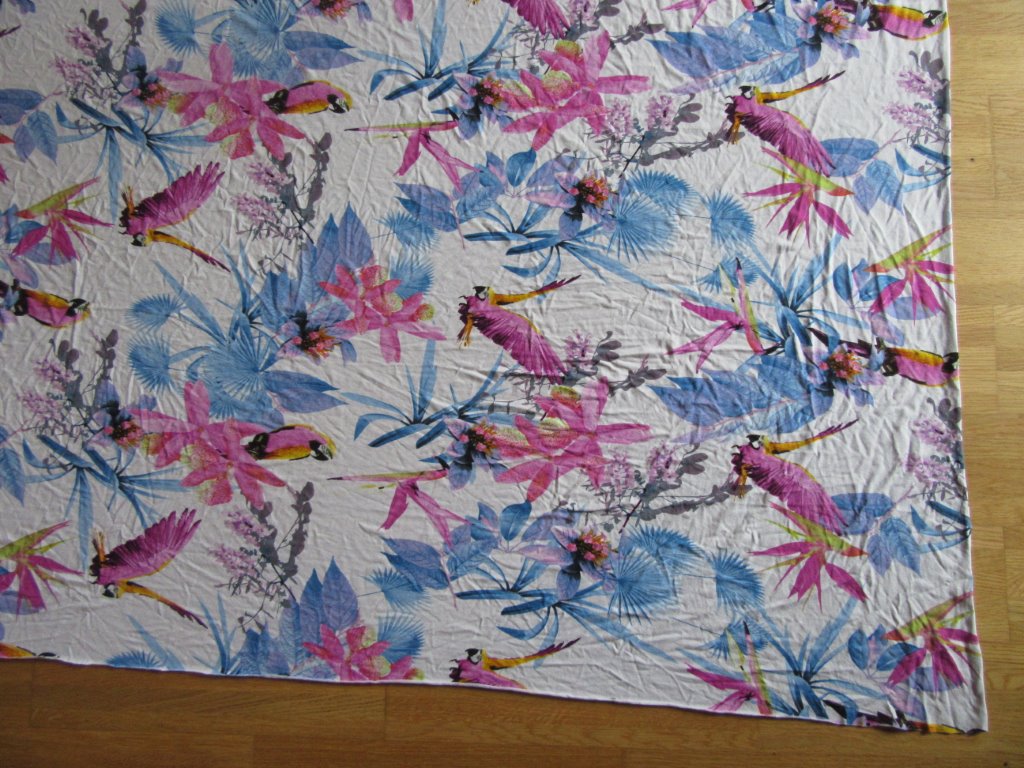 Der Stoff ist stretchig, 1,70 m x 1,70m groß. Habe ihn einmal gewaschen.