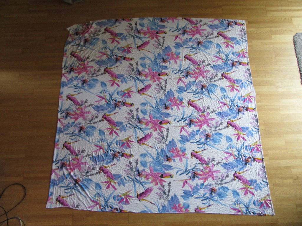 Der Stoff ist stretchig, 1,70 m x 1,70m groß. Habe ihn einmal gewaschen.