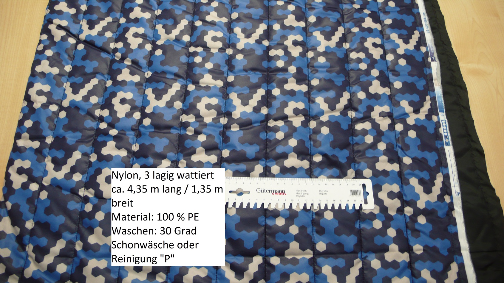 Jacken-Stoff (eignet sich bestimmt auch für Schneehosen oder Outdoor Overalls) 3 lagig (Oberstoff, Wattierung und Futter) 100 % PE und ca. 150 cm breit.