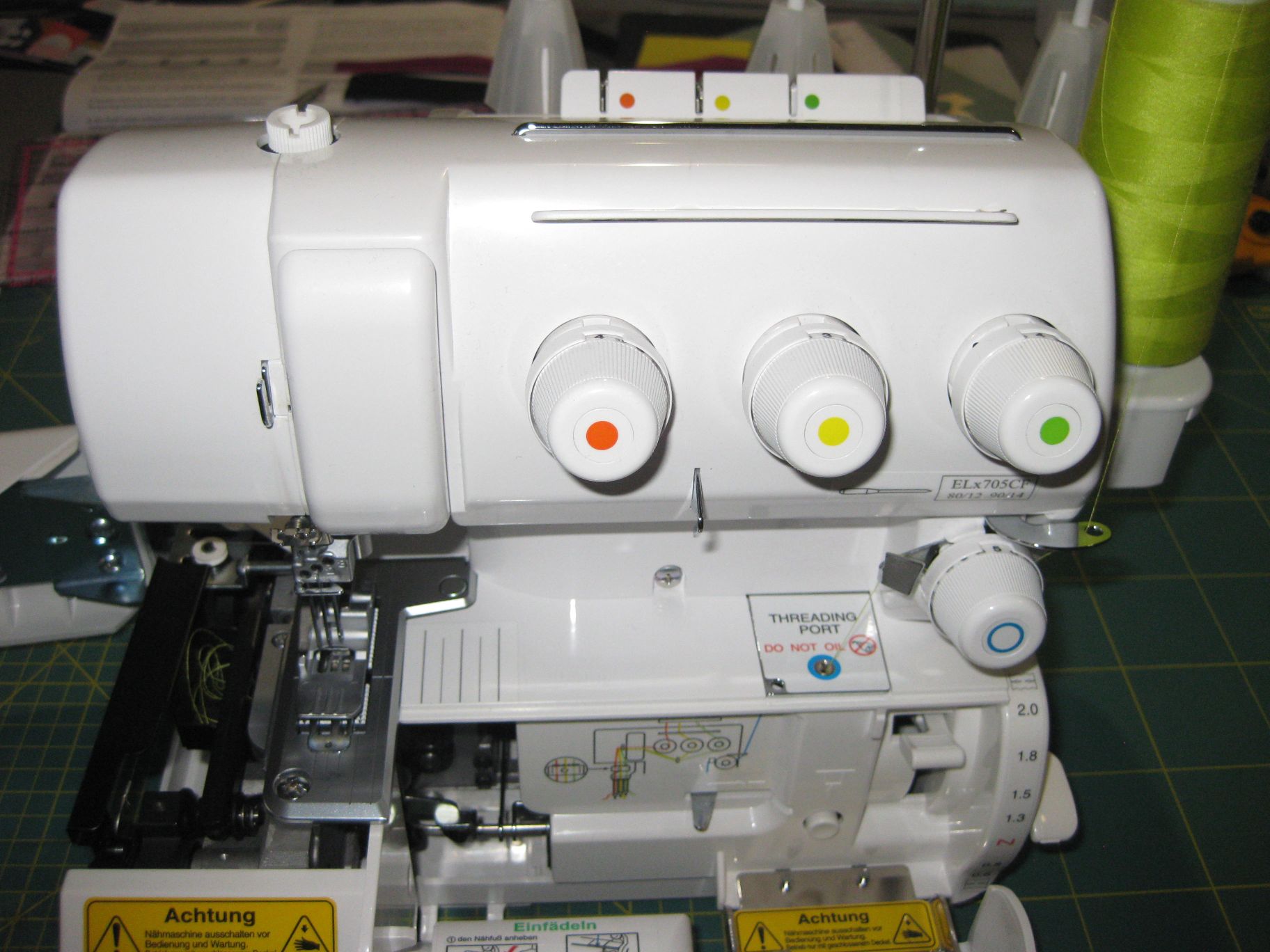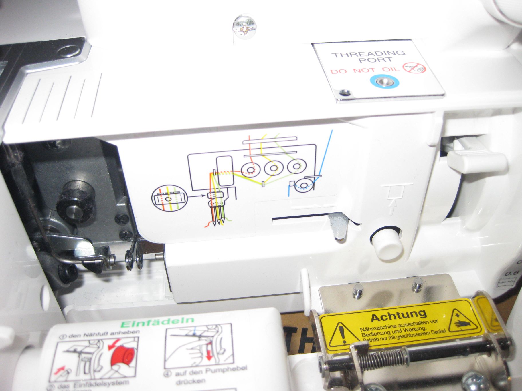 Nach jedem Nähprojekt wurde sie gereinigt (nur gepinselt und dann gesaugt, nicht gepustet!). Eine Wartung beim Fachhändler gab es in den vier Jahren kein.