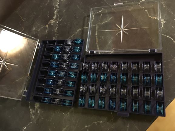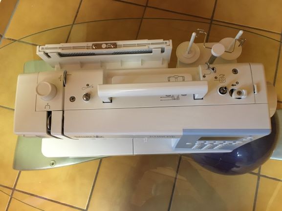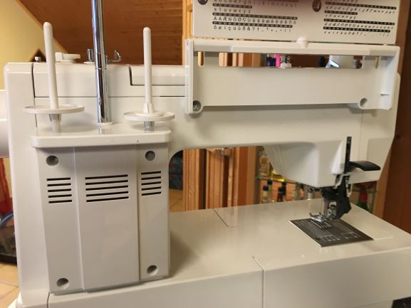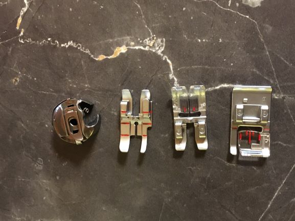 Zubehör: Unterfadenspulen, eine zweite Unterspule, Nähfüße, eine Stichplatte zum Sticken und