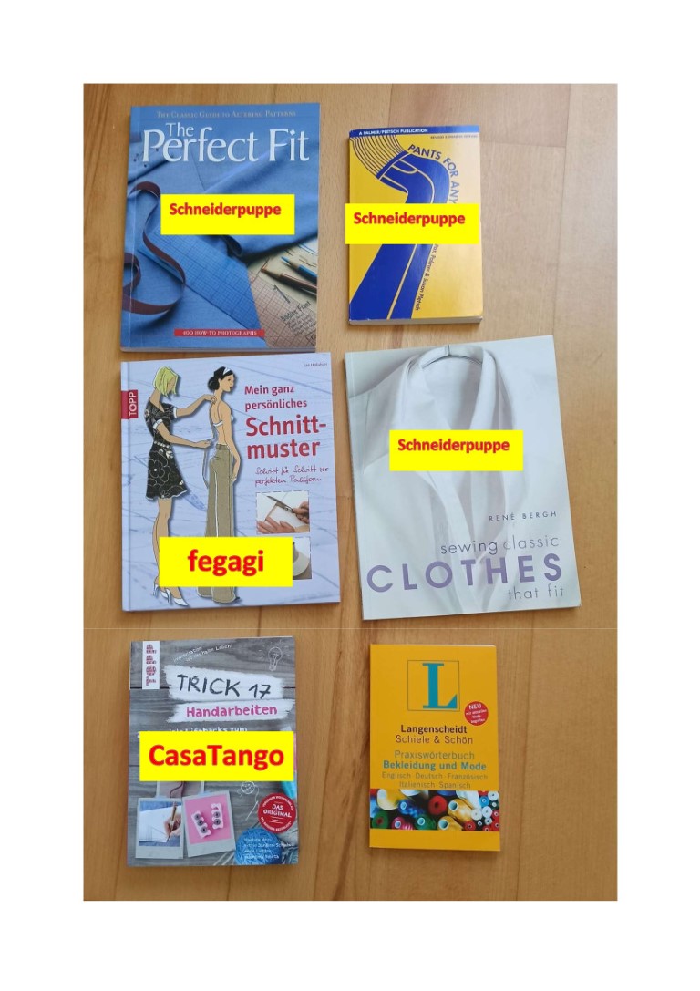 ich hätte Interesse an den drei verbliebenen englischen: "Pants for Anybody", "The perfect Fit" und "Sewing classic clothes that fit" sowie an der "Enzyklopädie Nähstiche und Stoffe", an "Omas Strickgeheimnisse" und an "Wellnessocken".