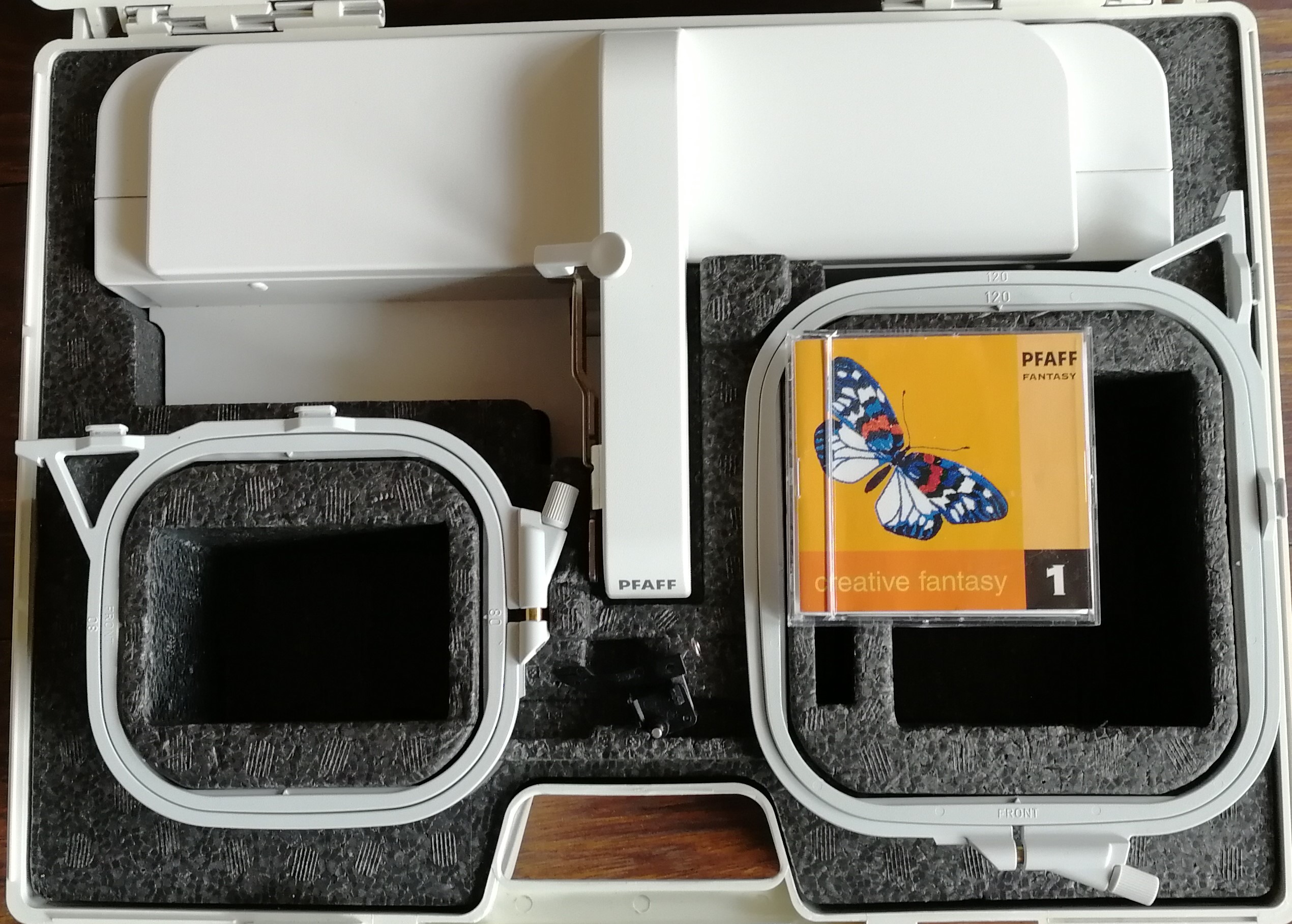 Für das Stickaggregat habe ich noch den BigRahmen sowie 9 zusätzliche Stickkarten.