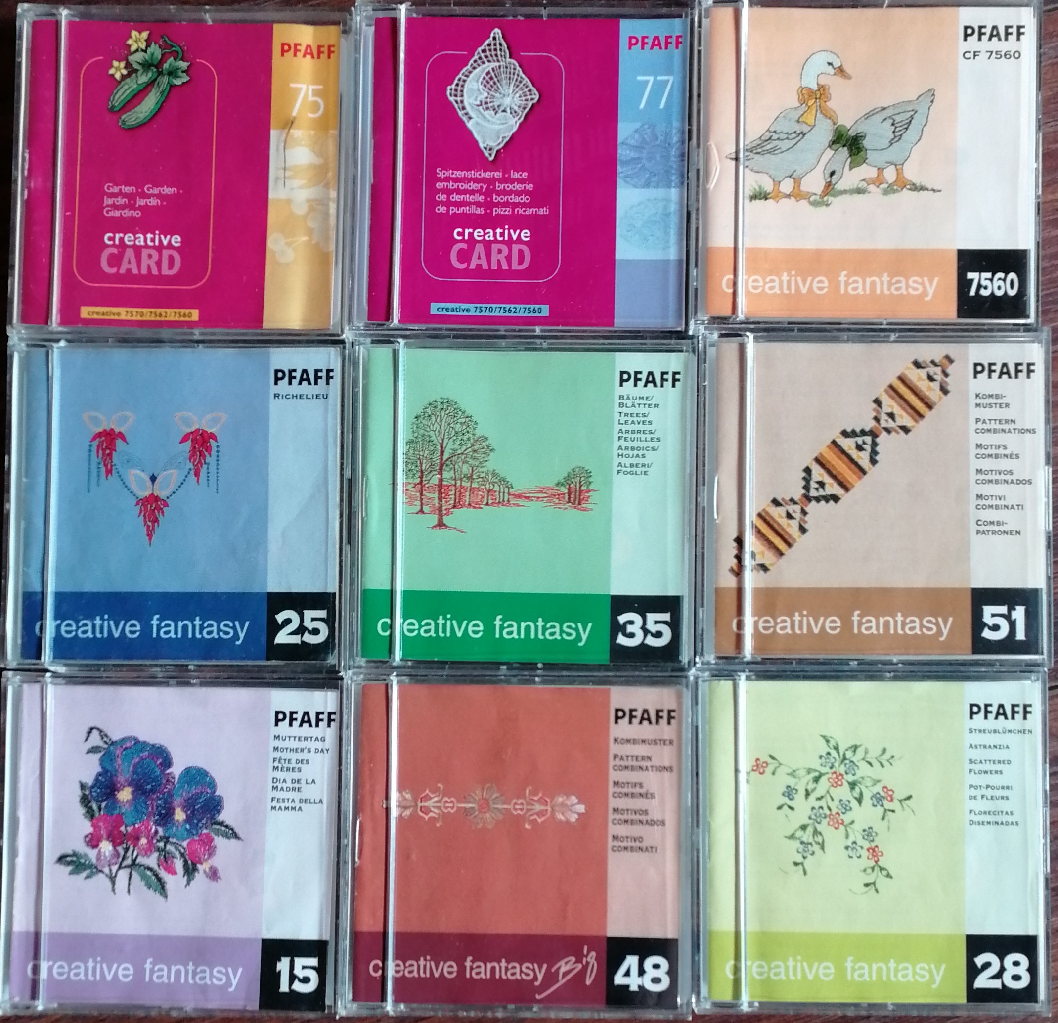 Auch gibt es die Software PC-Designer 2.2 dazu. Mit dieser Software kann man Stickmotive erstellen, bearbeiten und mit dem dazu gehörenden Kabel zur Nähmaschine schicken. Die werden dann auf der Leerkarte gespeichert. Leider läuft die Software nur bis Windows XP, ich habe ein altes Laptop, das ich zu diesem Zweck verwandt habe. Für den Anschluss an USB habe ich mir einen Adapter gekauft. Auf Wunsch könnte ich das Laptop und den Adapter mit abgeben. Für die Software habe ich noch Patchworkmotive erworben.