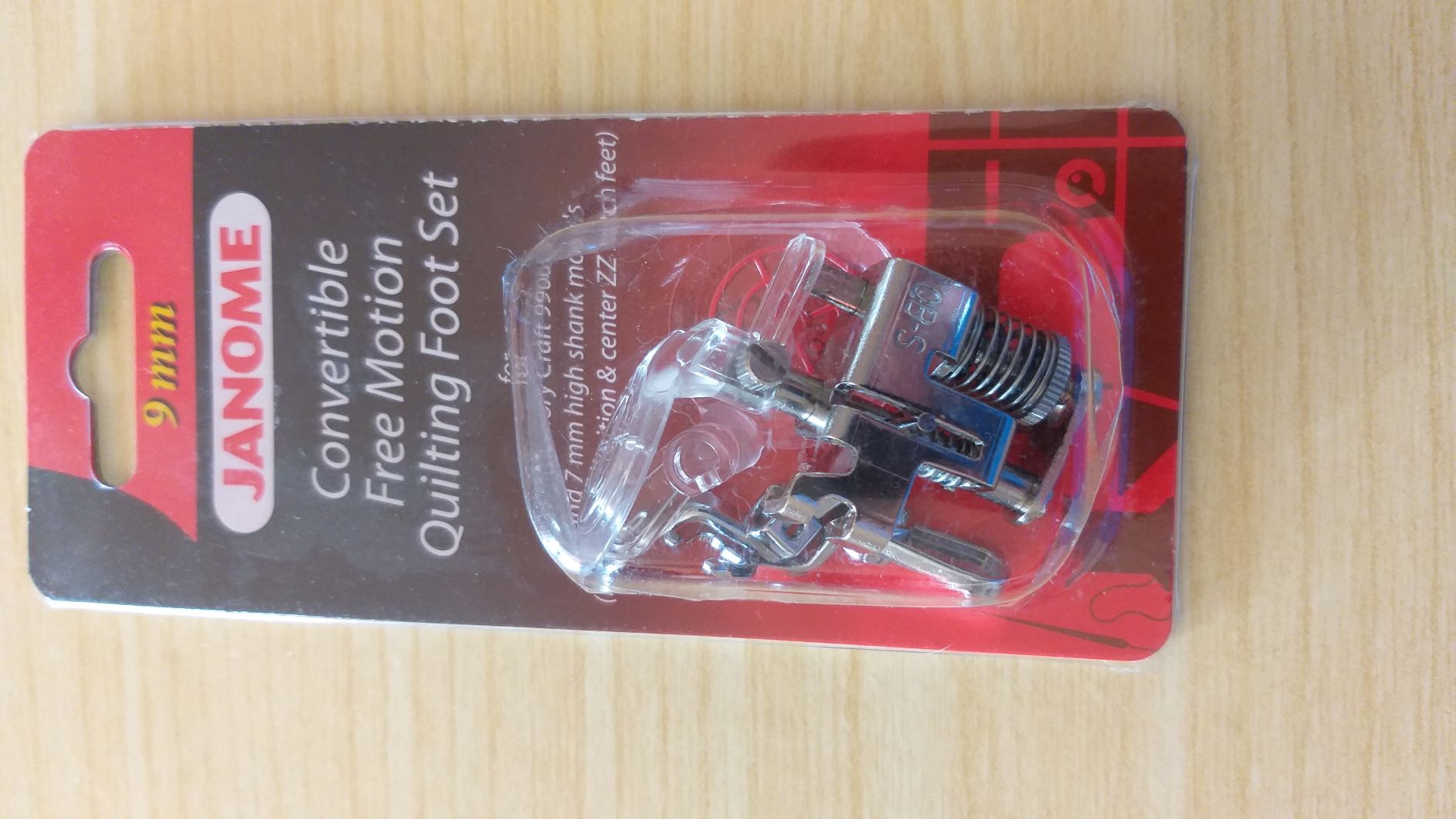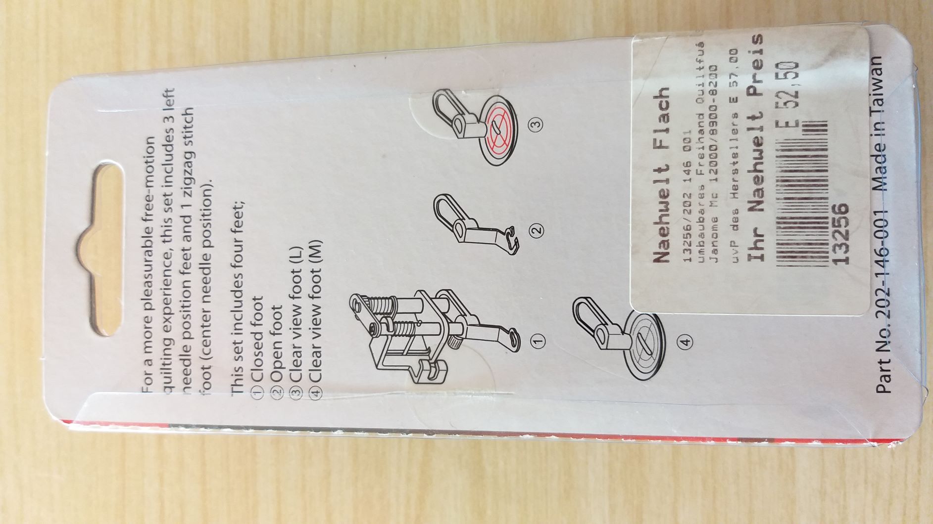 Der Fuß wird angeschraubt statt des vorhandenen Nähfußhalters, die Wechselsohlen verwenden Sie nach Bedarf, den Kunststoff-Teller für unregelmäßige Oberflächengestaltung, den offenen Quiltfuß, wenn Sie vorgezeichnete Linien nachfahren.