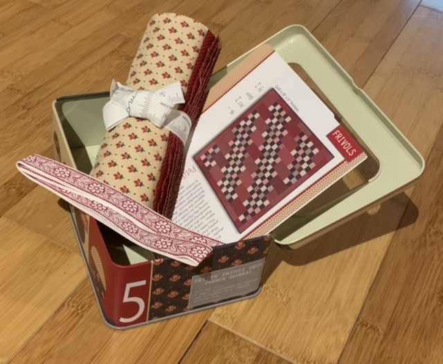 Die Blechdose beinhaltet 42 Stoffquadrate von 7x7“ (ausreichen für einen kleinen Quilt, ohne Rand-, Rückseiten-und Bindingstoff) und ein kleines Gutzi.