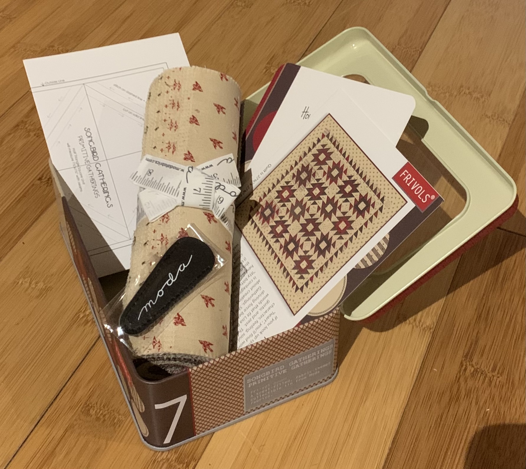 Die Blechdose beinhaltet 42 Stoffquadrate von 7x7“ (ausreichen für einen kleinen Quilt, ohne Rand-, Rückseiten-und Bindingstoff) und ein kleines Gutzi.