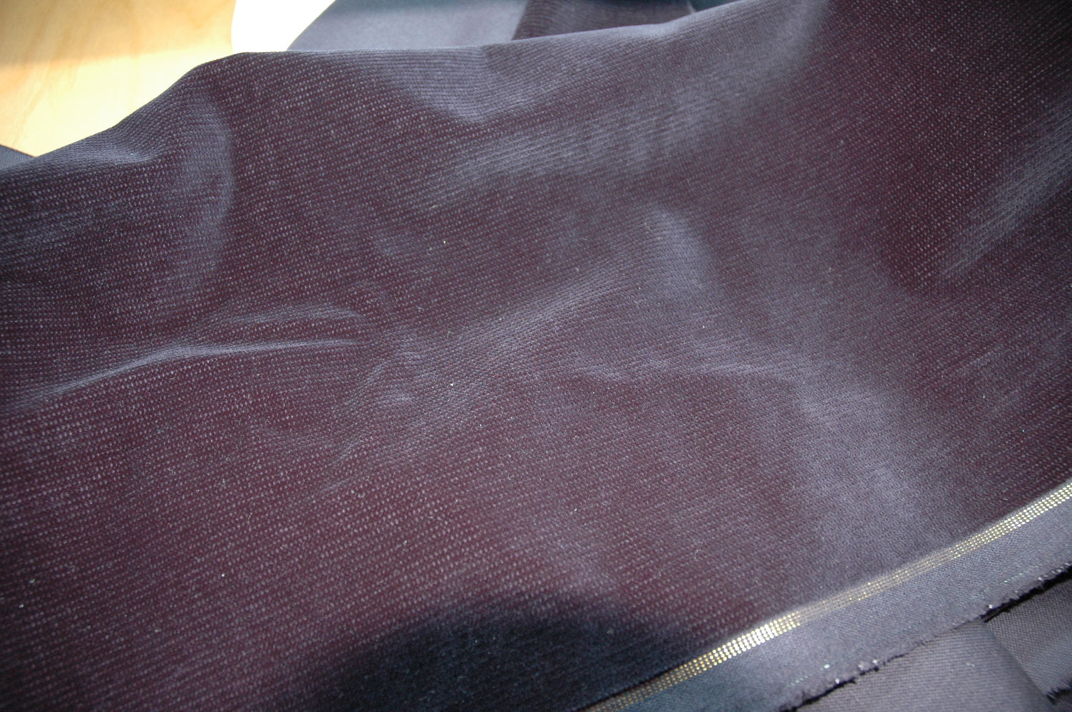 Sieht etwas aus wie Cord, ist aber Samt wie mit leichtem Längsstreifen. Allerdings fast nur in der Großaufnahme wie auf dem Bild.