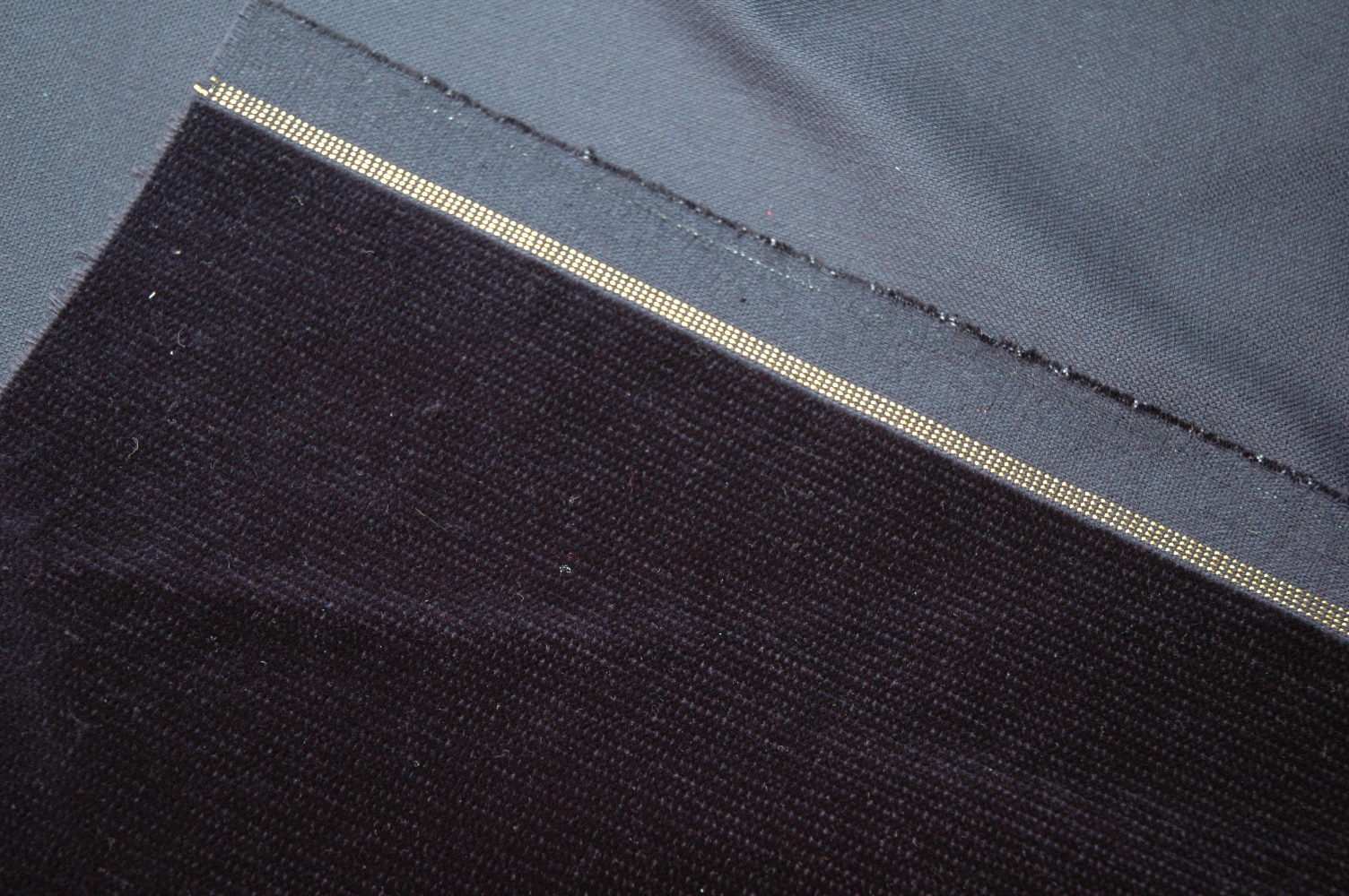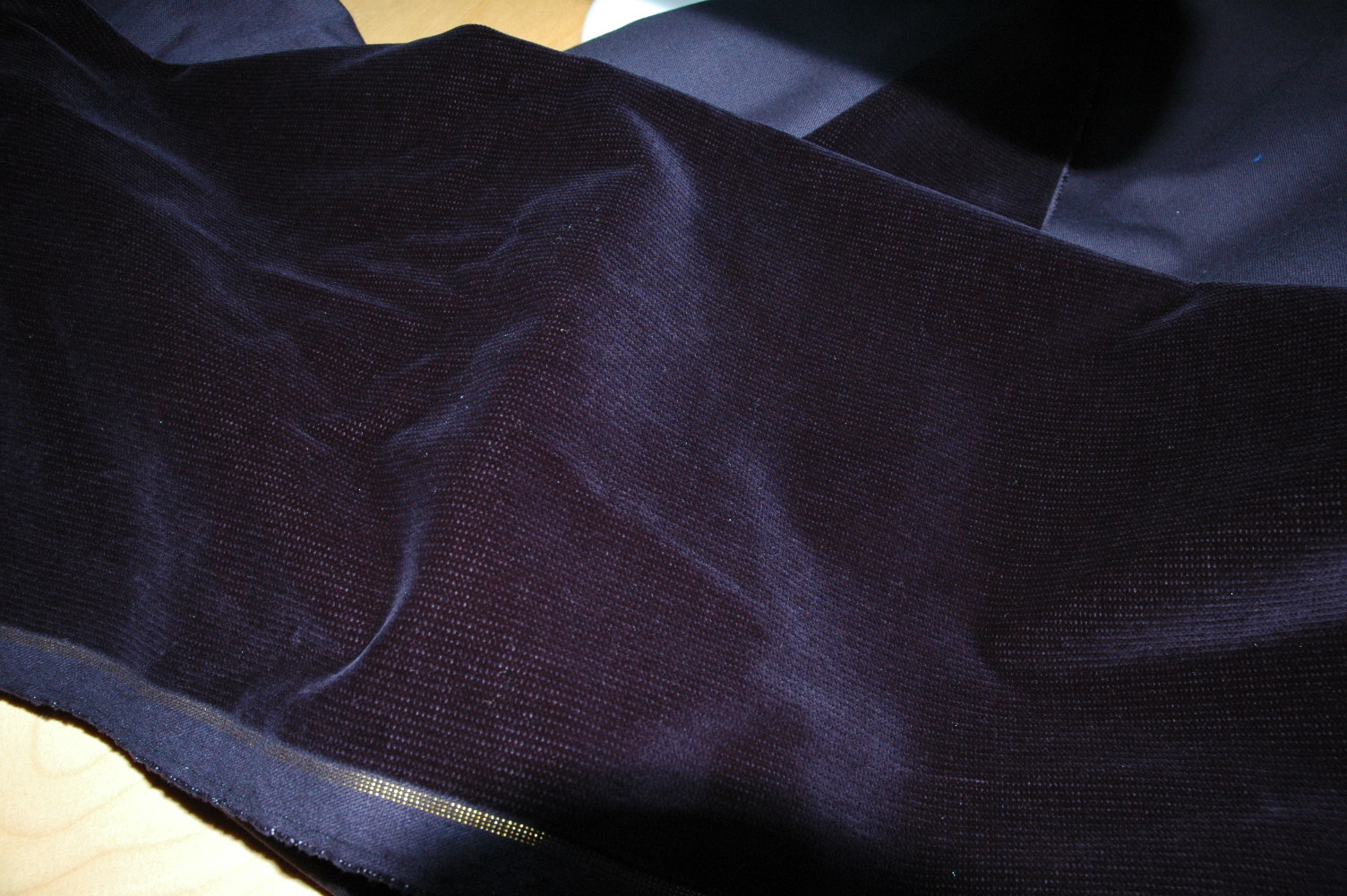 Wunderschöner Mitternachtsblauer, fast schwarzer Baumwollsamt. Der Samt wurde hängend gelagert. Hat also keine Liegefalten. Es ist eine Super Qualität mit Goldwebkante.